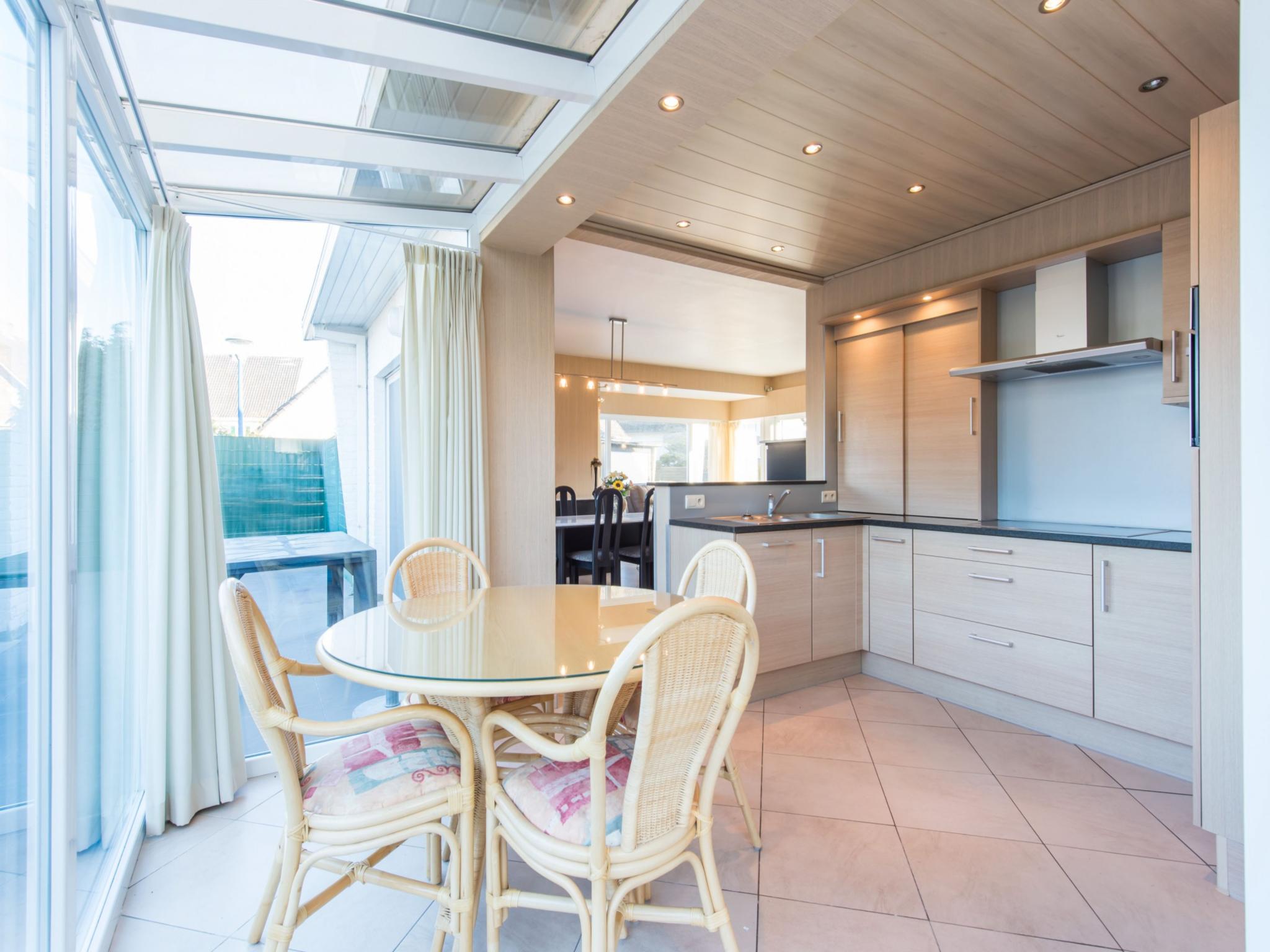 Begane grond: keuken met kookplaat(keramisch), afzuigkap, koffiezetapparaat(filtermaling, senseo pads), combimagnetron, afwasmachine, koelkast , woon/eetkamer met TV(flatscreen, digital), eettafel, zithoek , slaapkamer met badkamer met 2x 1-pers. bed(dekbed), douche, wastafel , toilet met wc , veranda met eettafel , vriezer, wasmachine, stofzuiger